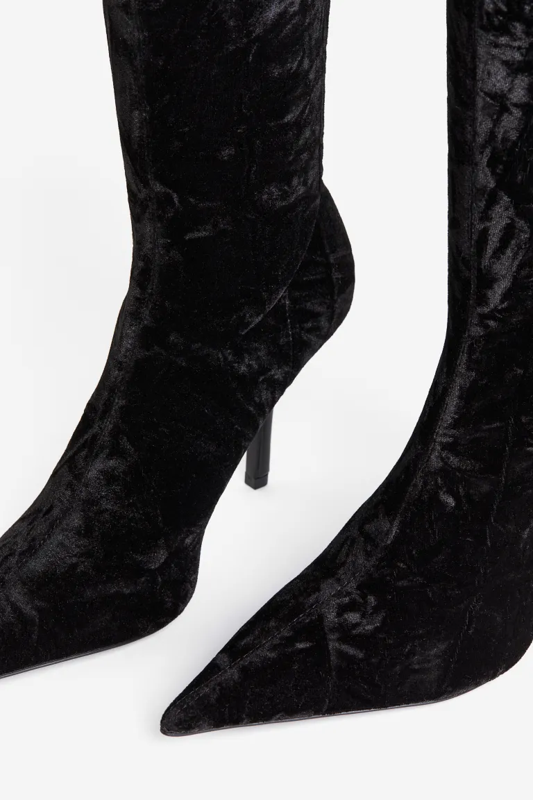 ①Knee-high boots with a fitted shaft in soft, stretchy velour. Pointed toes and thin heels.