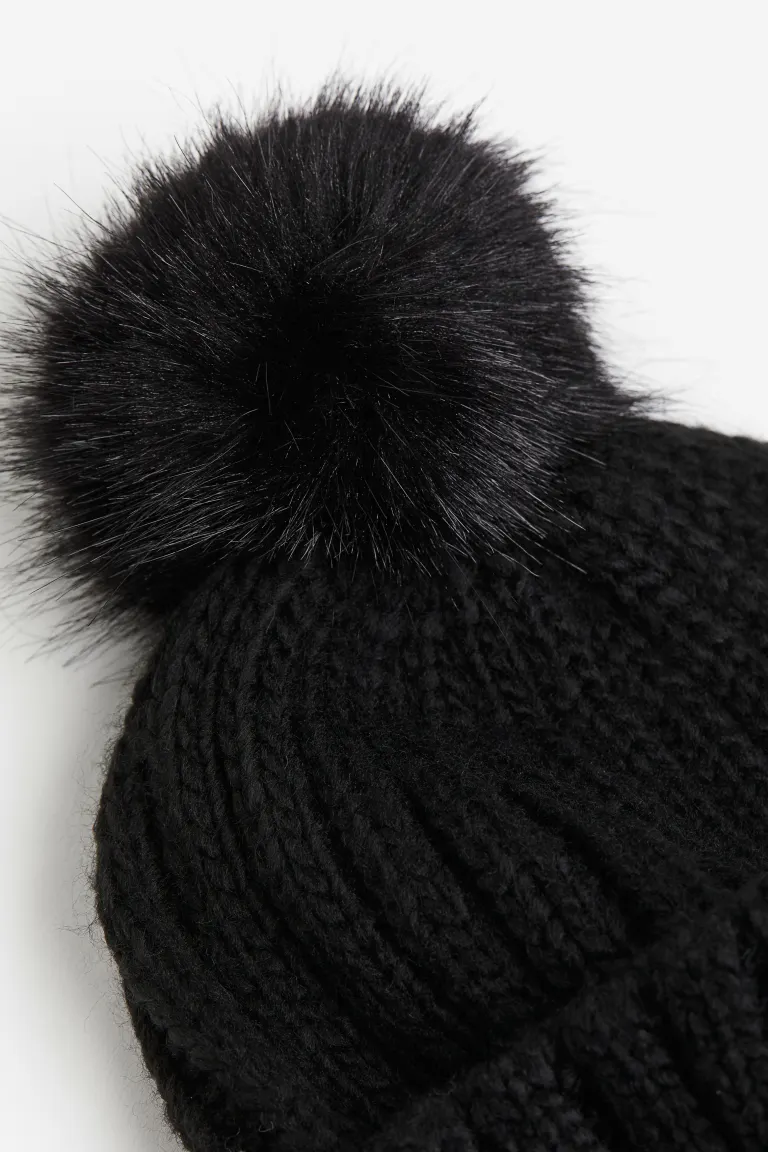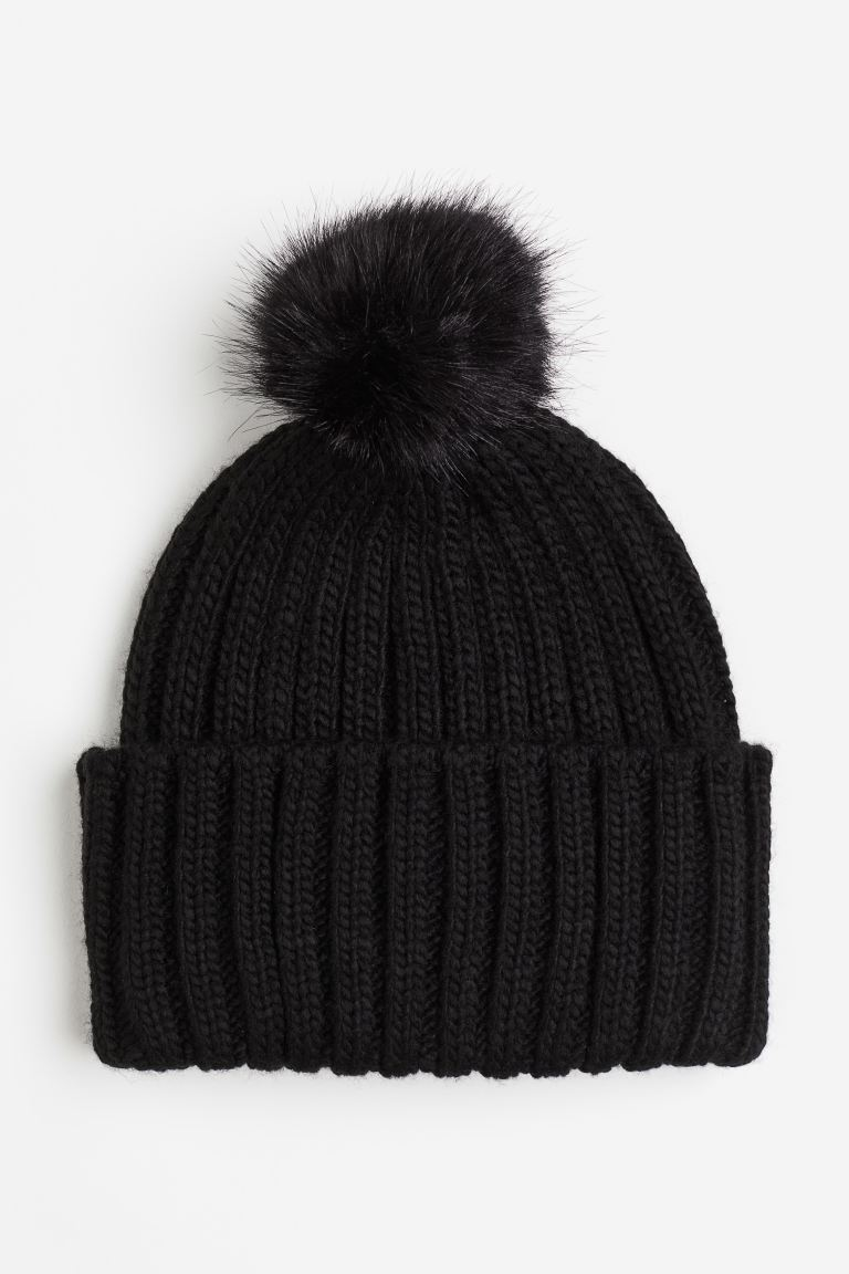 Hat in a soft rib knit with a fluffy pompom on top and a wide turn-up at the hem.