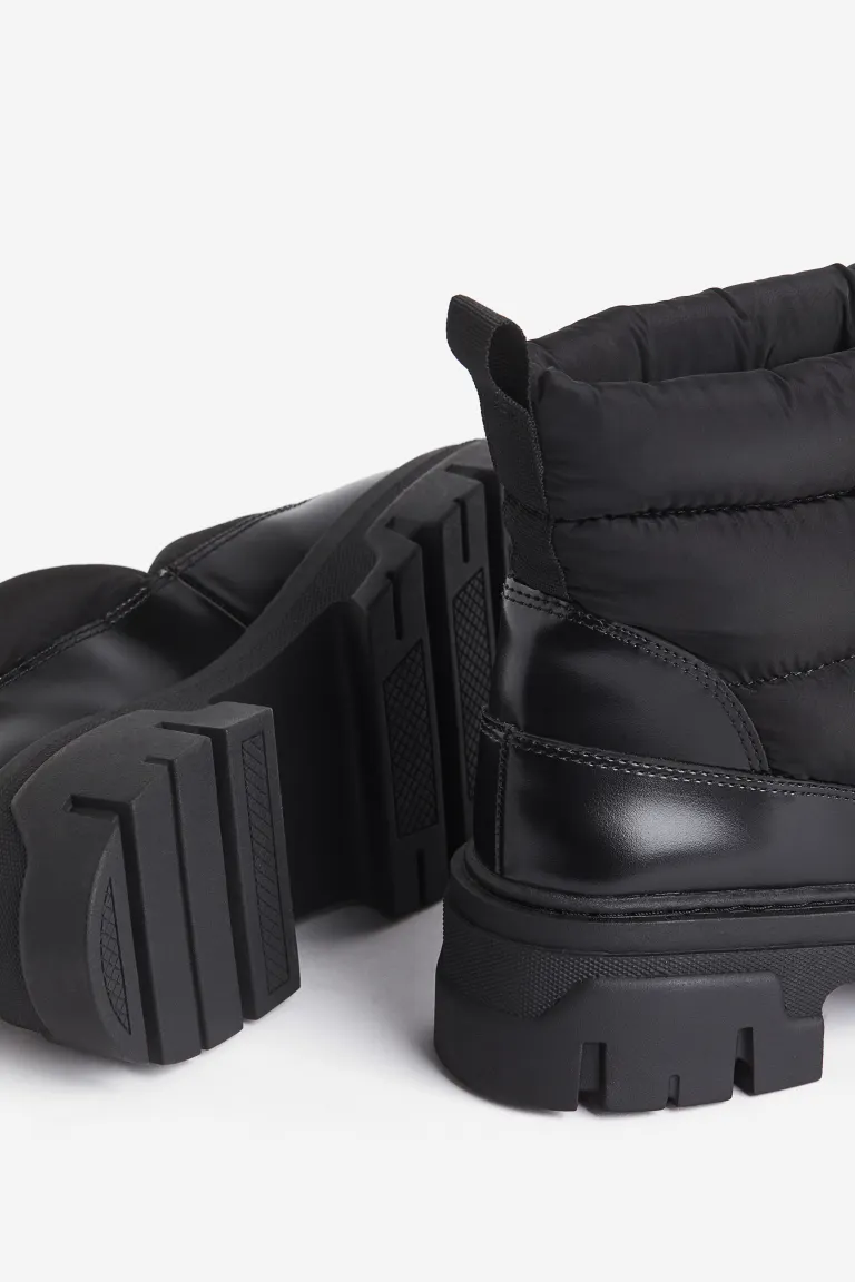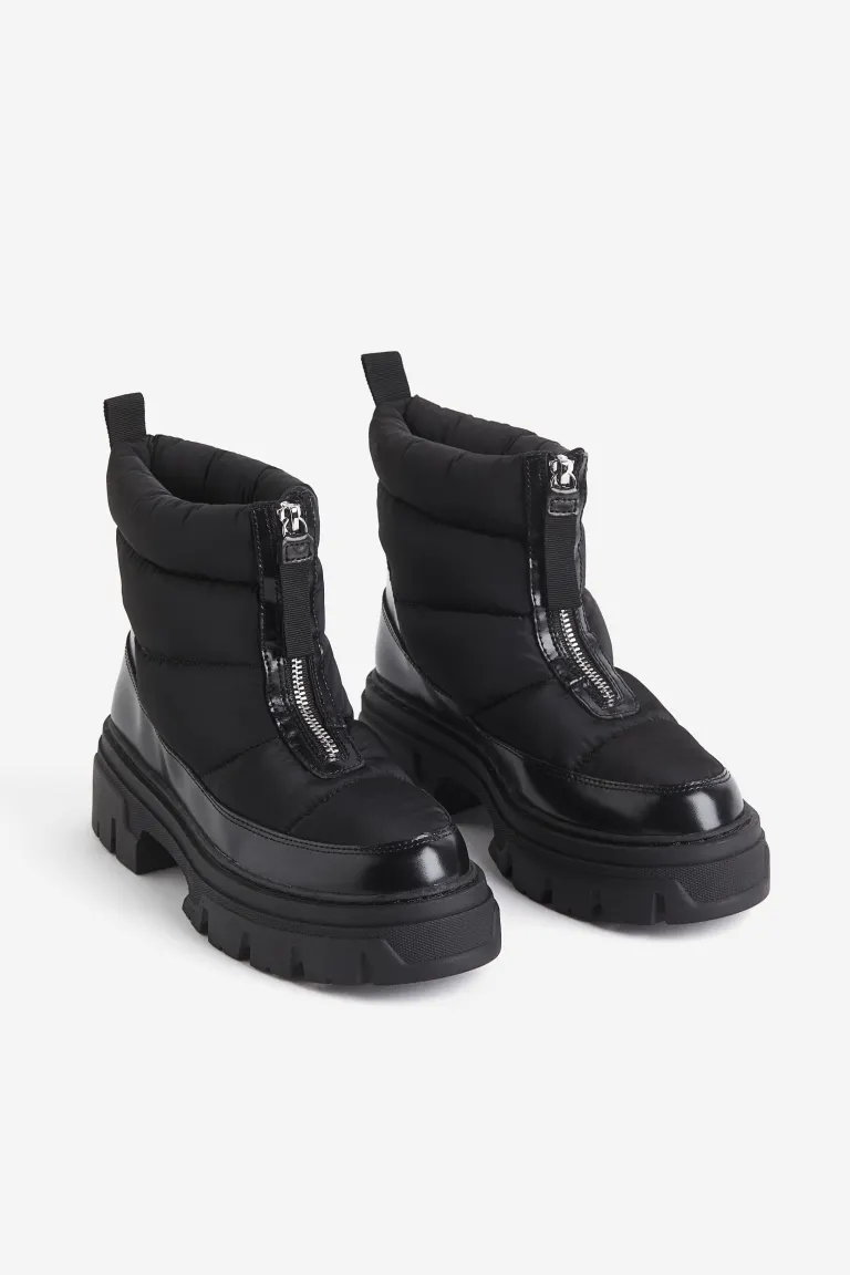 ①Warm-lined, padded ankle boots with a zip at the front and a loop at the back.