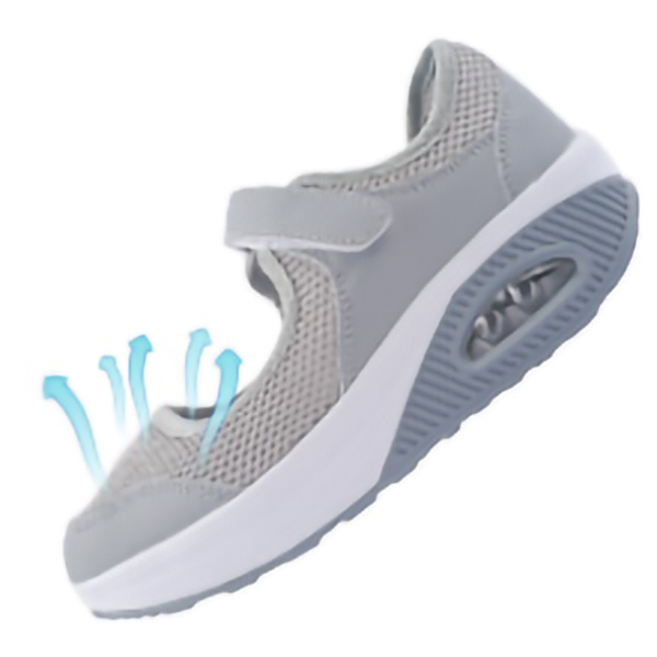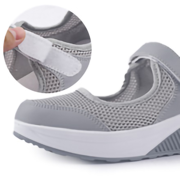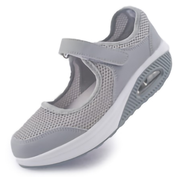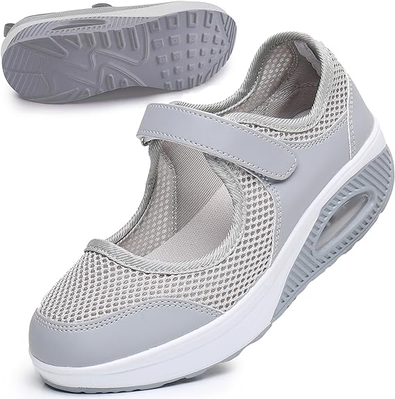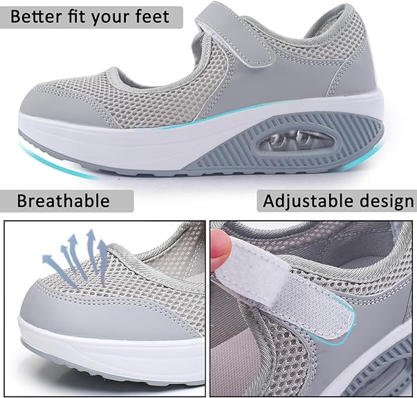 Adjustable closure which makes shoes loose or tight. Special air cushioned sole with arch support. Wide round toe breath cloth with elastic hollow out knit upper, keeps your feet more comfortable.
